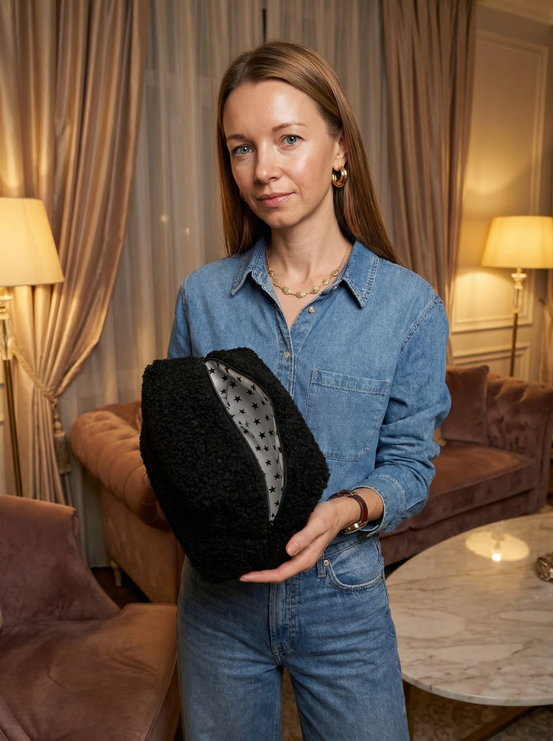 Juoda teddy rankų darbo kosmetinė – klasikinė, talpi ir praktiška. Išorė iš minkšto teddy audinio, vidus – 100 % medvilnė su žvaigždučių raštu. Tinka makiažio ir odos priežiūros priemonėms. Pasiūta Lietuvoje, su dėmesiu kokybei ir detalėms.